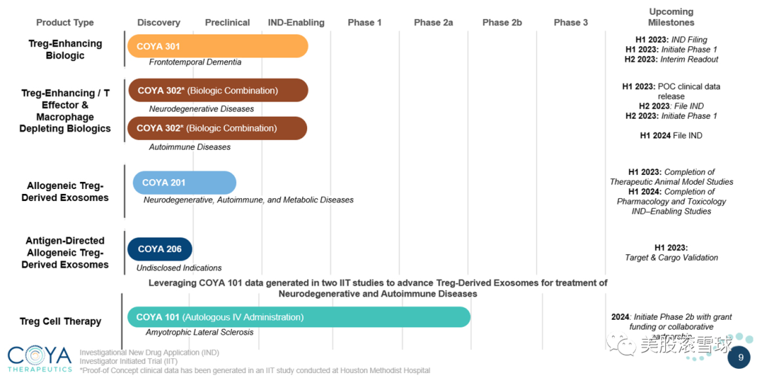 公司的主要候選藥物COYA 101正在進行治療肌萎縮側索硬化症(ALS)的2a 期試驗,預計在2024年啟動2b期試驗。公司的其他在研管線處於臨牀前階段。