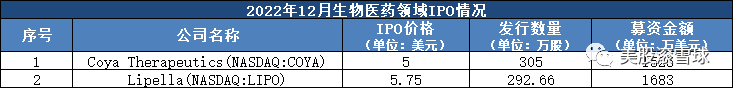12月,有2家醫藥公司採用IPO形式上市,突破了10月和11月各有一家的記錄,但少於去年同期IPO的數量。