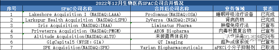 11月,有2家生物醫藥公司完成SPAC合併上市,4家SPAC公司宣佈與生物醫藥企業合併,1家SPAC公司宣佈終止與生物醫藥企業的合併。