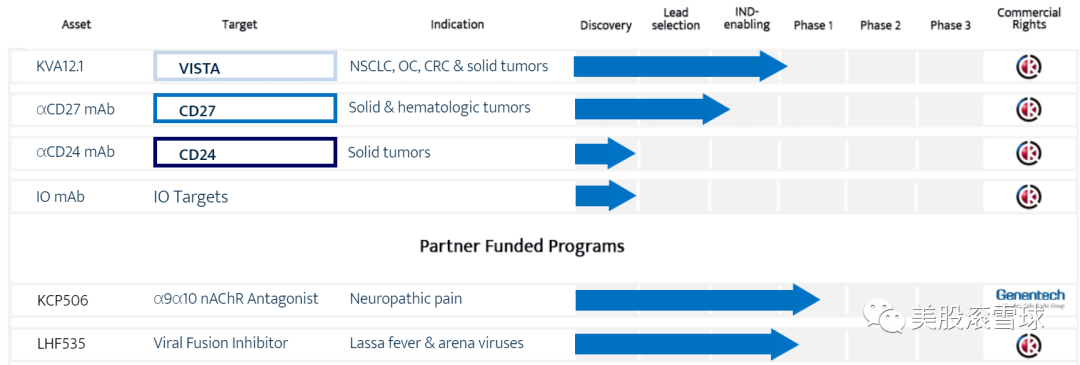 Kineta與基因泰克、國家過敏和傳染病研究所(NIAID)、國際嚴重急性呼吸系統和新發感染聯盟( ISARIC )等均有合作,藥物靶點新穎(VISTA、CD27、CD24、α9α10 nAChR),目標市場較大(KCP506:美國潛在56萬例慢性神經性疼痛;LHF535:非洲潛在10-30萬例拉沙熱/年;KVA12.1:潛在多癌種免疫療法),待早期數據發佈,進入臨牀中晚期之后,值得再次關注。