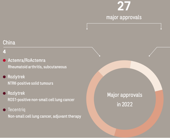 從地區來看,中國區的戰績顯然拖了后腿。財報披露,由於生物類似藥的衝擊、頭孢曲松鈉(集採產品)銷售額的下降,以及中國的新冠防控措施的影響,中國區的銷售額下降了7%。可喜的是,其2018年在中國獲批的帕妥珠單抗正在抵消這些衝擊,2022年在中國實現了迅猛增長。