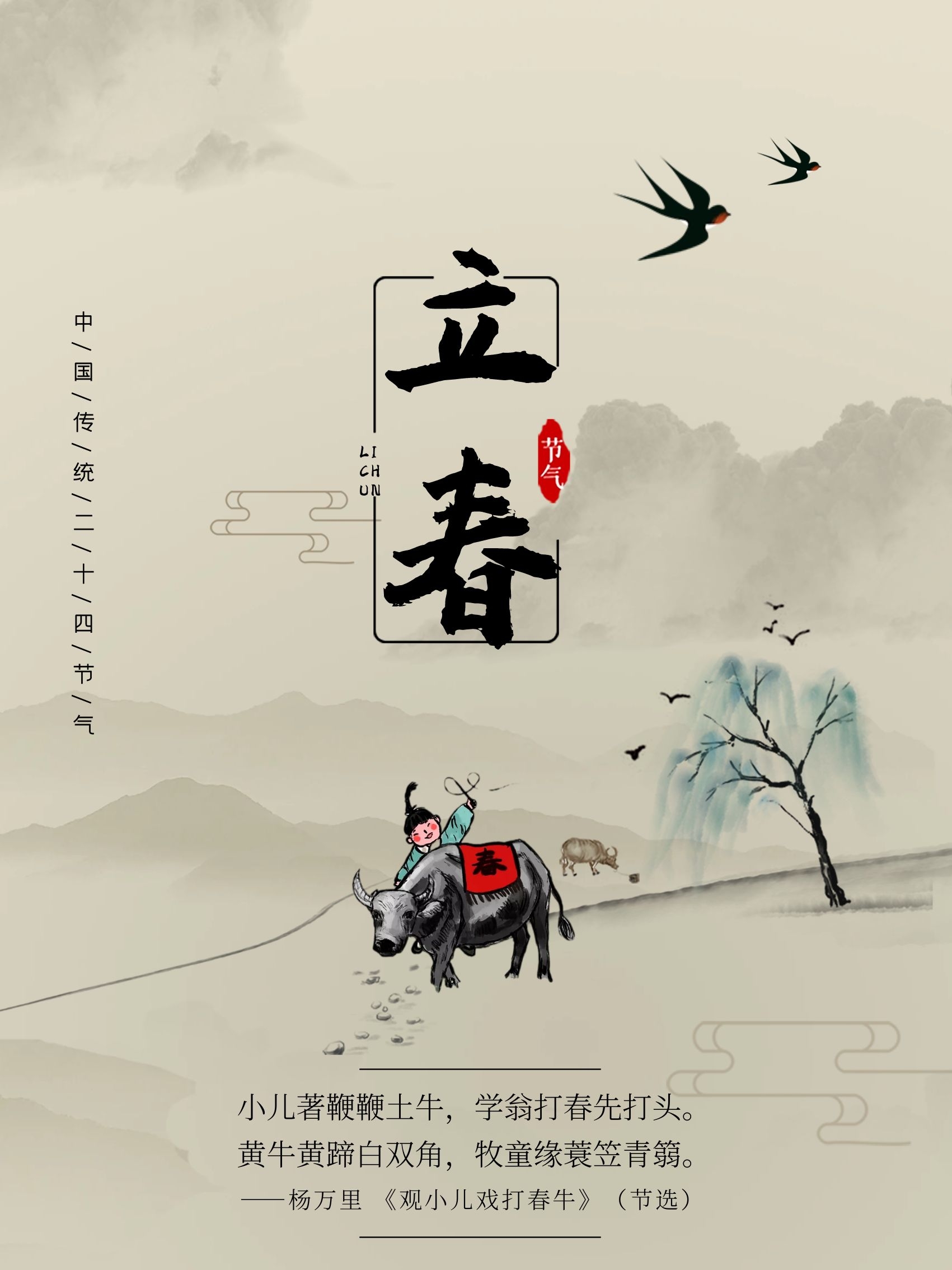 楊萬里的《觀小兒戲打春牛》中描寫的是古人立春打土牛的場景。這里的「牛」並不是真牛,而是用泥土塑造的一個牛狀物,稱為「春牛」。立春當天,古人舉行隆重的「打牛」儀式,並認為把土牛打得越碎越好,以示人們對春天的熱愛。隨后,人們歡笑着搶泥牛的土塊帶回家入牲圈,象徵槽頭興旺。隨着朝代更替,「打春牛」逐漸成為立春迎春重要的儀式和內容。人們以鞭打春牛為樂事,稱為「打春」。
