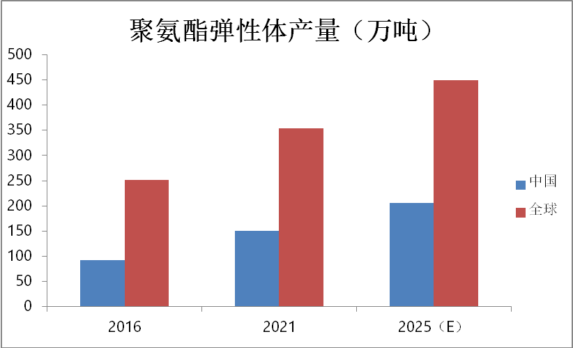 從全球範圍來看,2016年全球聚氨酯彈性體產量達到252萬噸,2021年全球產量達353.9萬噸,年複合增長率為7.0%。到2025年,全球聚氨酯彈性體產量預計將達到449.5萬噸,呈快速穩步發展趨勢。
