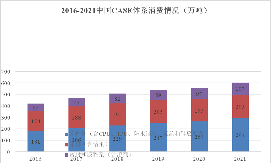 根據相關機構的數據統計,2021年中國聚氨酯CASE(彈性體、塗料、合成革漿料、密封和膠黏劑)消費量為777萬噸,2016~2021年年均增長率達到11.5%。