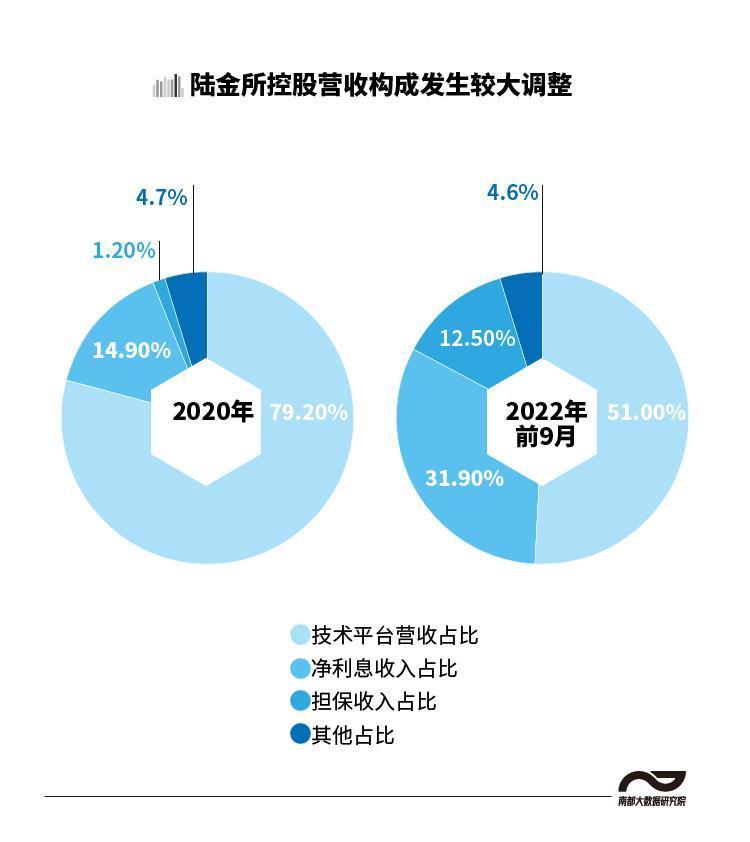 此外,南都大數據研究院查閲招股書數據發現,陸金所控股2022年的營收構成較其2020年上市初期相比,已經發生了很大的變化。根據招股書介紹,陸金所控股的總營業收入主要由技術平臺收入、淨利息收入、擔保收入、投資收入和其他收入等部分構成。