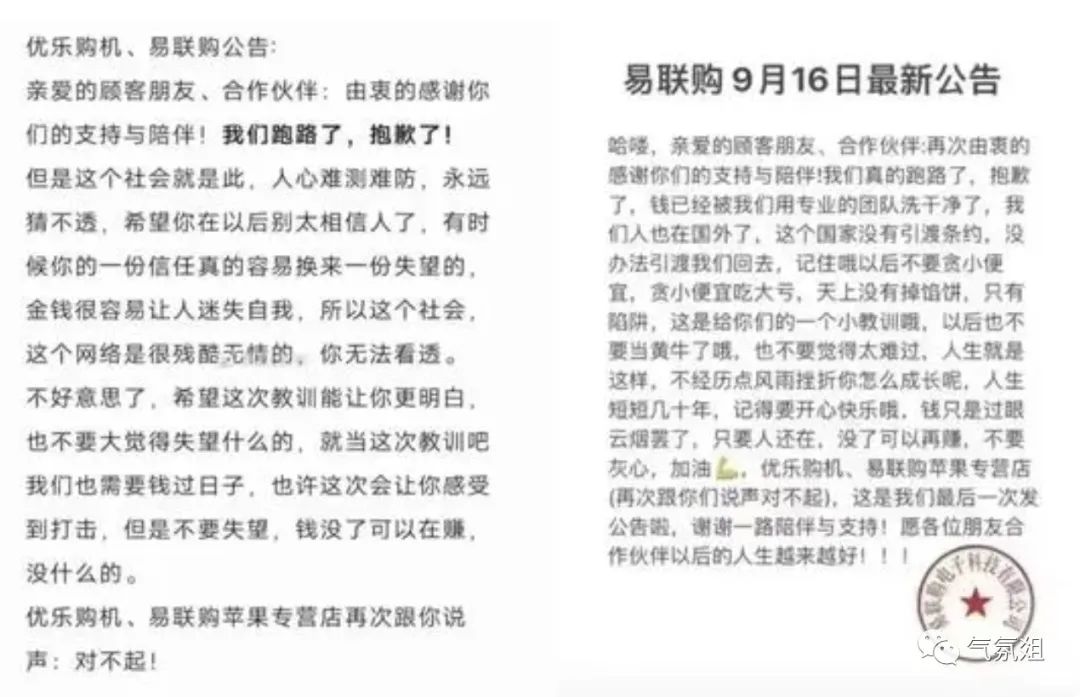 3、這種高調不要臉的跑路通知,從去年到現在大概有4封,結構雷同,有的句子一字不差。去年9月,預售IPhone14的小程序易聯購線上商城暴雷,出過兩封公告,上來就是「我們跑路了,抱歉了!」另一封説,錢已經洗乾淨了,我們人也在國外了,這個國家沒有引渡條約,沒辦法引渡我們回去,記住以后別貪小便宜。去年6月,B圈一個數字藏品平臺天穹,發了一個公告,很短,説「出於人道主義發個最后的公告,很遺憾經營不當跑路。各位韭菜們好自為之吧,感謝各位一個月的付出。已經財富自由各位后會有期漂亮國見。」騙子直接叫受騙者韭菜,良心都壞了。