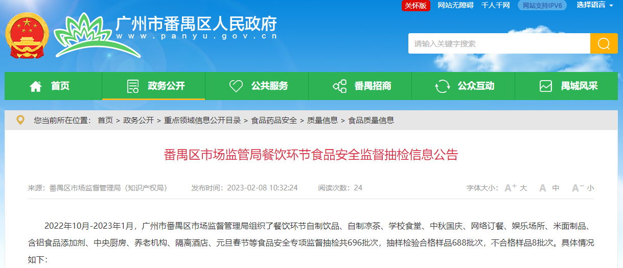 中國質量新聞網訊 據廣州市番禺區人民政府網站2023年2月8日消息,2022年10月-2023年1月,廣州市番禺區市場監督管理局組織了餐飲環節自制飲品、自制涼茶、學校食堂、中秋國慶、網絡訂餐、娛樂場所、米麪製品、含鋁食品添加劑、中央廚房、養老機構、隔離酒店、元旦春節等食品安全專項監督抽檢。