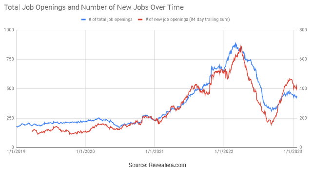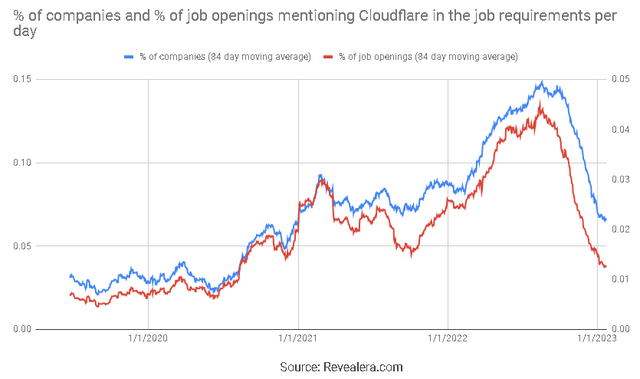 涉及Cloudflare的職位空缺數量在2022年下半年大幅下降,這可能表明未來幾個季度將進一步疲軟。不過,由於Cloudflare轉向高端市場,這一點很難確定。大量的客户增長可能在相當大的程度上抵消整體的疲軟。