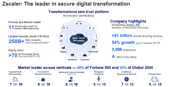 Zscaler提供了一個完整的網絡安全平臺,旨在保護用户層面的數據和應用程序,相比之下,前面提到的CRWD保護端點設備。Zscaler是一個明顯的市場領導者,擁有40%的財富和500強客户。