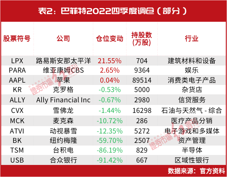 具體來看,巴菲特在四季度增倉了3只個股,分別為建築公司路易斯安娜太平洋(LPX.N)、媒體及娛樂公司派拉蒙全球(PARAA.O)和蘋果(AAPL.US),減持了8只個股,包括臺積電、美國合衆銀行、動視暴雪、雪佛龍等。