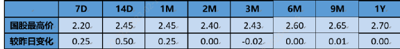 今日NCD交投情緒一般,全天季內存單上行幅度較大,更長期限存單小幅上行,尾盤存單交投情緒稍清淡。具體來看,3月到期2.30;6月到期2.42;7月到期2.515;9月到期2.525;12月到期2.595。今日銀行間短券上午交投情緒一般,受下午資金緊張影響,6月底之前到期的短券價格上行2-5BP,更長期限短券價格基本持平,弱資質短券小幅下行,買盤銀行、基金為主。