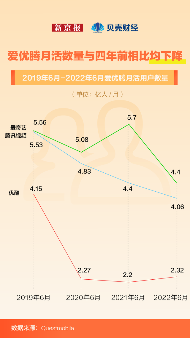 與此同時,長視頻平臺還面臨短視頻的衝擊,其月活躍用户還遭受短視頻平臺的蠶食和攫取。其會員漲價策略也會使得一部分付費意願較低的用户流失。貝殼財經記者梳理QuestMobile數據發現,愛優騰2022年6月月活躍用户數量與2019年同期相比,均顯著下降。