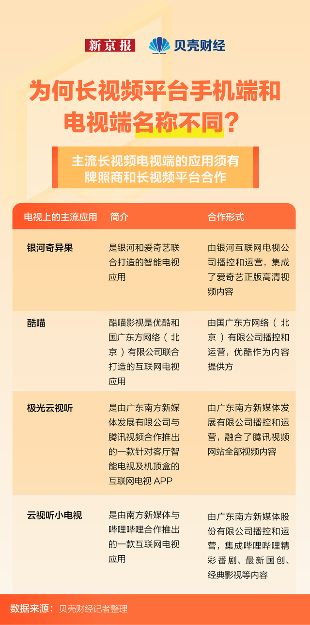 因為長視頻平臺並無集成播控牌照,只能作為「內容服務合作方」與牌照方旗下的企業合作才能在電視端向消費者提供視聽服務,從而使得他們的應用需要在電視端與手機端採用不同的名稱。