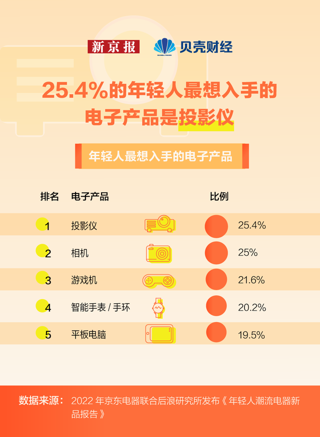 隨着科技的進步和消費需求的升級,越來越多的年輕人選擇放棄電視,轉而購買投影儀。據2022年京東電器聯合后浪研究所發佈《年輕人潮流電器新品報告》顯示,在當代年輕人當中呼聲最高的「新三大件」分別為掃地機器人、投影儀、摺疊屏手機。其中,投影儀是年輕人最想入手的電子產品。