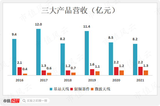 而基站天線的營收波動較大,且2021年規模較上市之初還有所下滑,説0增長已經是最客氣的稱呼了。