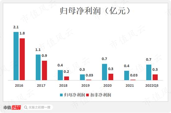 雖説營收表現不盡如人意,但好歹也有所增長,而利潤端這邊,就是典型的「上市即巔峰「:上市之初歸母淨利潤2.1億,2021年直接跌至0.4億,扣非淨利潤才256萬。