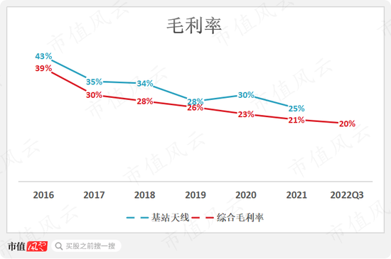國內通信網絡的建設具有一定的周期性,受4G行業整體下行、市場競爭加劇等影響,公司基站天線毛利率自2016年的43%降至2021年的25%,同期的綜合毛利率從39%降至21%,近乎腰斬。