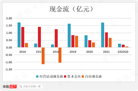 從現金流來看,雖然公司一直能保持正的經營性現金流入,但由於歷年的資本支出也不低,合計來看,累計創造6.61億經營現金流的同時,也累計流出6.62億資本開支,最終就是「混日子」,並沒有真正掙到錢。