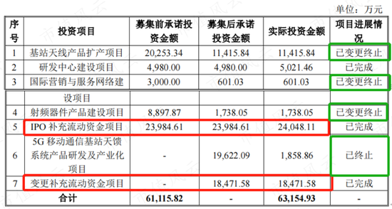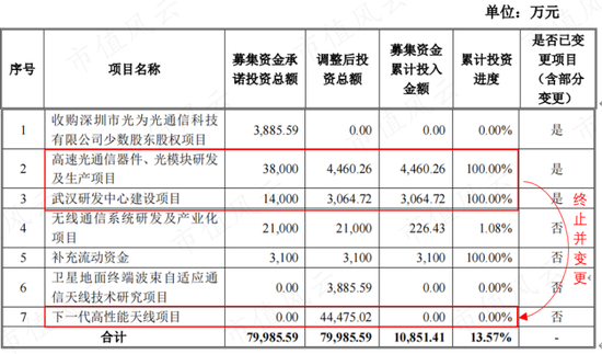 其中以「光模塊市場競爭激烈、國外光通信行業政策的不確定性及深圳光為業績不達預期「為由,2022年終止並變更相關項目用於「下一代高性能天線項目」,涉及資金超4億,超過募資金額的一半。