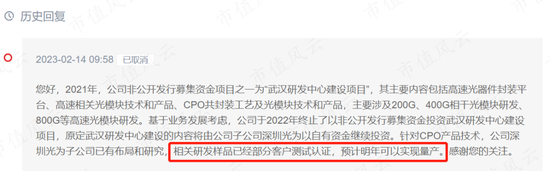 公司回覆稱,2021年的「武漢研發中心建設項目」包括高速光器件封裝平臺、高速相關光模塊技術和產品、CPO共封裝工藝及光模塊技術和產品。