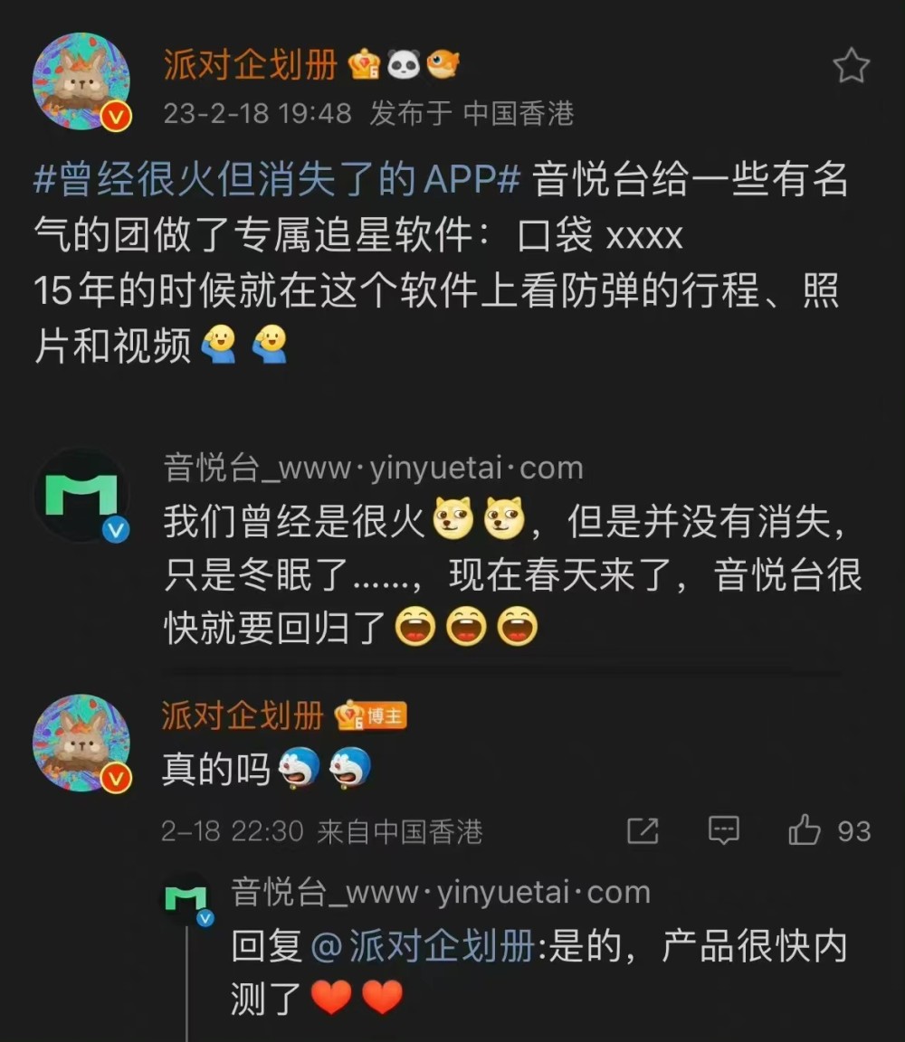 2月18日,音悦台官博稱要回歸,很快就要內測。