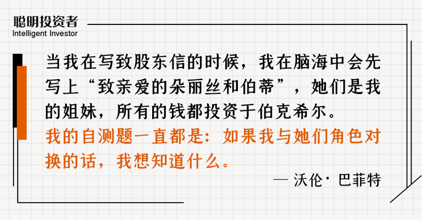他給自己的自測題一直都是:如果我與他們(那些不一定了解太多金融專業知識的股東)角色對換的話,我想知道什麼。如果多麗絲和伯蒂(巴菲特的姐妹)在管理伯克希爾,而我住在加州卡梅爾鎮的話,我想從管理者那里瞭解什麼內容。