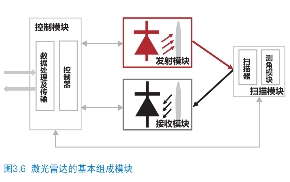 車載激光雷達的工作原理,其實説來也簡單。作為一種主動測距方式,激光雷達通過發射激光束並探測回波 信號,獲取目標的位置特徵量。激光雷達的基本組成如圖下所示,主要由發射模塊、接收模塊、掃描模塊和控制模塊4個子模塊組成。