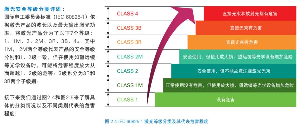 國際電工委員會標準(IEC 60825-1)依據激光產品的波長、最大輸出激光功率或能量將激光產品分爲了幾個大的安全等級——1類,1M類,2類,2M類,3R類,3B類,4類。