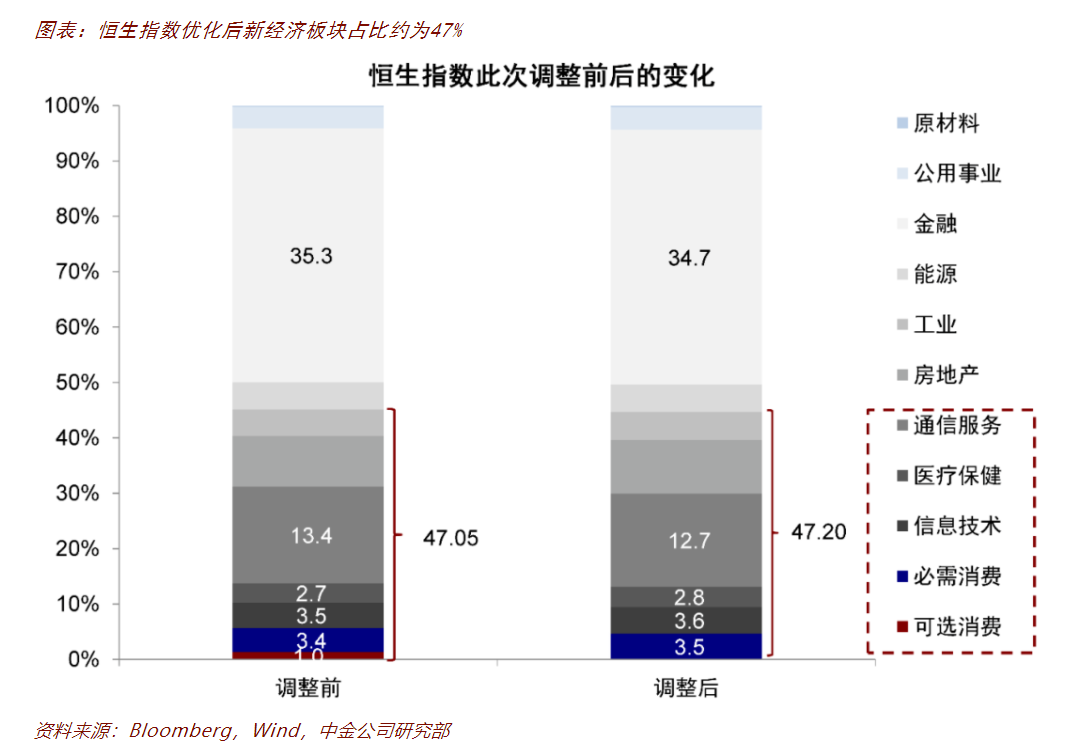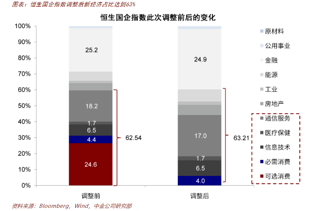 調整后指數特徵:恆指維持76支,消費板塊佔比提升;國企新經濟佔比63%