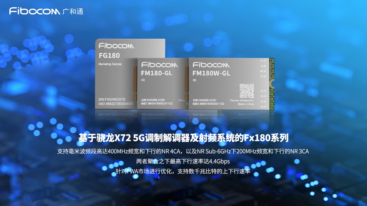 除了基於驍龍X75 5G調制解調器及射頻系統的Fx190系列外,廣和通還推出基於驍龍X72的Fx180系列,其支持毫米波頻段高達400MHz頻寬和下行的NR 4CA,以及NR Sub-6GHz下200MHz頻寬和下行的NR 3CA,兩者聚合之下最高下行速率達4.4Gbps。Fx180系列針對FWA市場進行優化,支持數千兆比特的上下行速率。
