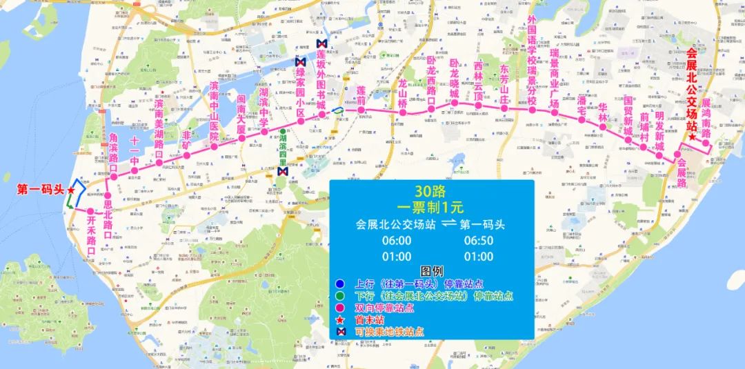 下行:第一碼頭始發,經西堤路、廈禾路至「開禾路口」站接原線路行至環島干道會展北路口,改經會展北路、展鴻路、展鴻南路至會展北公交場站。