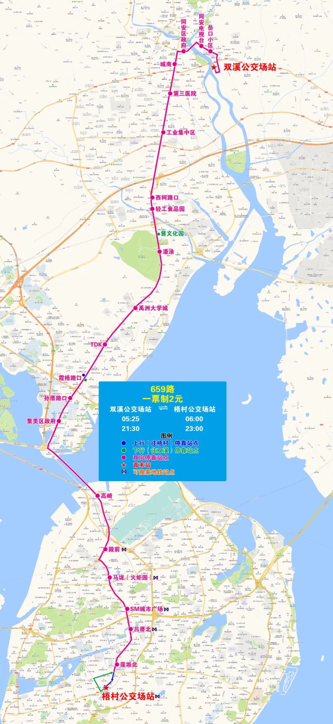 2.停靠站點:后溪公交場站、新田、后溪新村、三興社區、蘇營村、前進村、后溪、城內、永祥新城、集美大道、東蔡、軟件園三期F區(蔡亭南路的新設站點)。