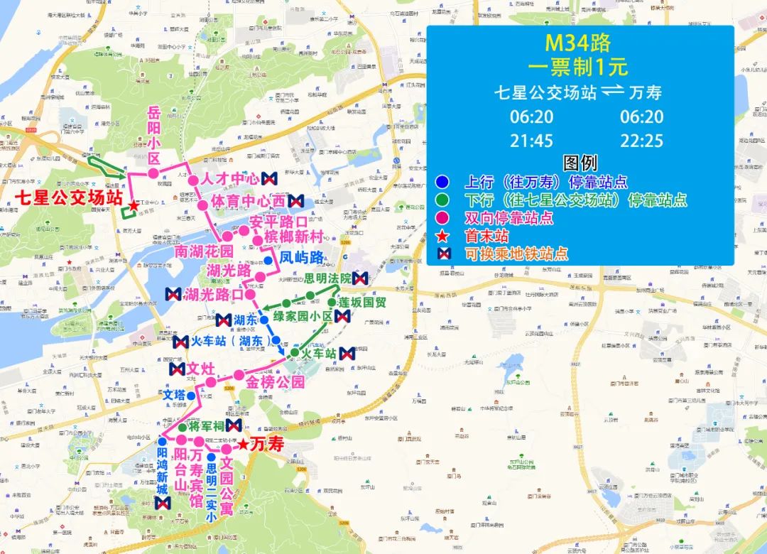 (一)新增M34路,方便岳陽小區、檳榔、萬壽片區乘客接駁地鐵人才中心站、體育中心站、湖濱東路站、廈門火車站、文灶站、將軍祠站等站點