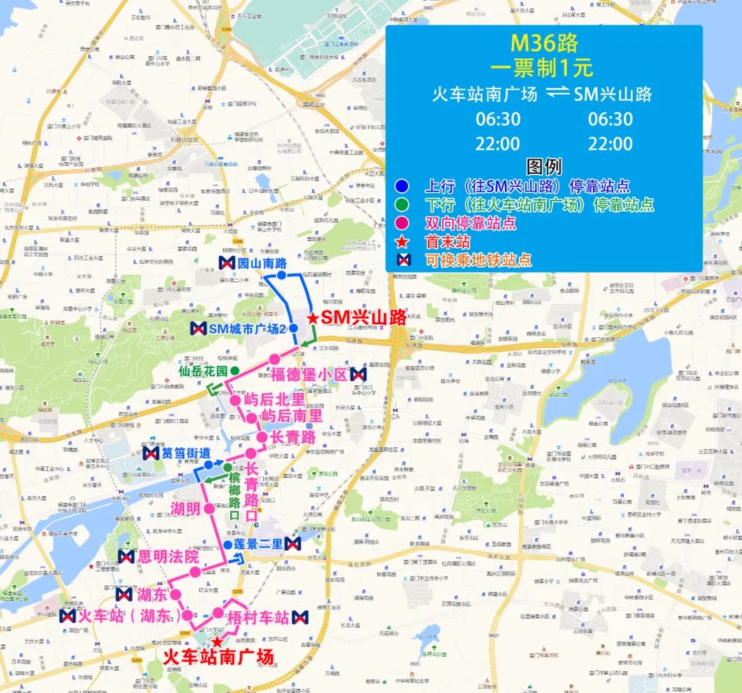 (三)93路調整為M36路,方便湖明、嶼后片區乘客接駁地鐵廈門火車站、湖濱東路站、蓮阪站、育秀東路站、烏石浦站等站點