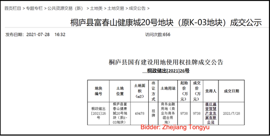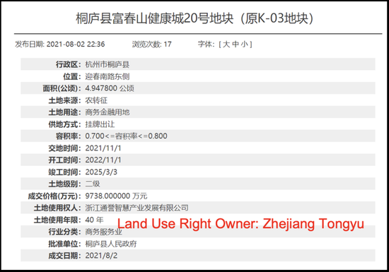 桐廬縣地方政府披露顯示,浙江通譽於2021年7月28日以人民幣9,738萬元的價格購買土地,土地用途為商務金融用地。土地總面積為49,478平方米。