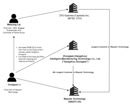 我們認為,中通的管理層很可能參與了未披露的關聯方交易,以使中科微至及其創始人李功燕受益。下圖顯示了中通與中科微至以及李功燕和賴梅松之間的關係。