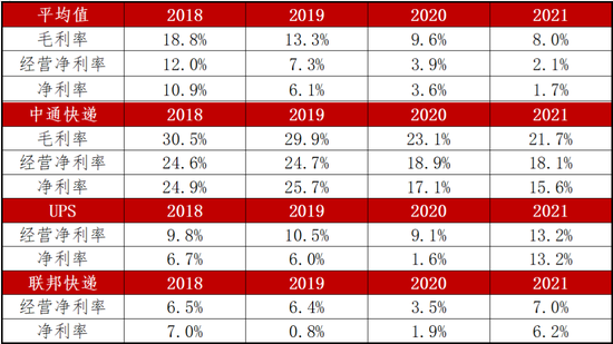 接下來,我們整理了中國四家領先的快遞公司的平均毛利率、經營淨利率和淨利率。我們還將這些指標與美國一流的物流公司UPS(UPS.NYSE)和聯邦快遞(FDX.NYSE)進行了比較。