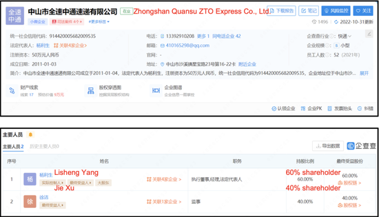 企查查顯示,楊利生和徐潔兩人分別擁有中山全速60%和40%的股全。中山泉速將中通列為其商標,表明其作為中通實體運營。