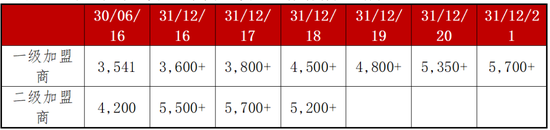 根據該公司的披露,自2016年以來,其一級加盟商從2016年的約3,500增加到截至2021年12月31日的5,700+。根據其2021年年度報告,公司與其二級加盟商之間的關係描述如下: