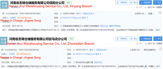 還有另外兩家公司均由中通100%控股,註冊地址與河南中通快遞相同。這些實體分別是河南省吉瑞物流有限公司,(河南吉瑞)和河南省吉瑞倉儲服務有限公司(吉瑞倉儲)。