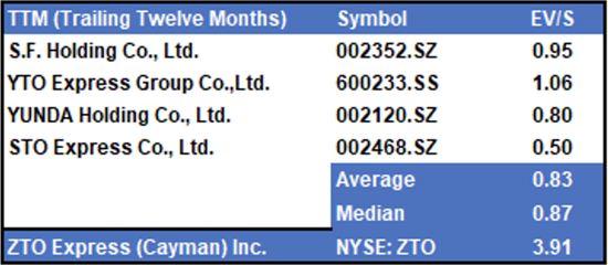 在中國,有幾家快遞公司與中通競爭。其中,順豐控股(002352.SZ)、圓通速遞(600233.SH)、韻達股份(002120.SZ)和申通快遞(002468.SZ)都擁有可觀的市場份額。我們認為,這些可比公司,可供投資者參考中通快遞(ZTO.NYSE)的估值。