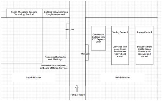 下圖顯示了帶有中通標誌和中通快遞中文名稱的商業建築。根據我們與該地區附近人員的交談,我們確認河南中通快遞也位於該地區。
