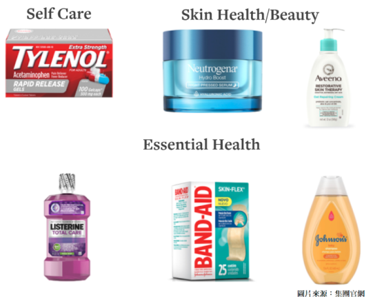 1)消費者健康部門(Consumer Health)包括專注於皮膚健康、美容等個人護理產品,目前每日就有超過12億人使用,較知名品牌包括AVEENO、CLEAN & CLEAR、JOHNSON'S、NEUTROGENA等。
