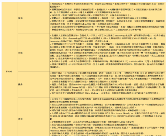另外,公司最大銷售額產品STELARA,2021財年佔集團總收入9.7%,此產品的美國和歐洲部分專利於2023年和2024年到期,或會令集團收入造成波動。