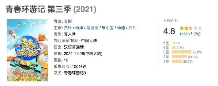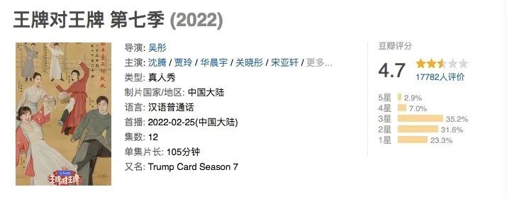 《王牌對王牌7》豆瓣評分首度跌破及格線至4.7分,這家老牌IP也在今年春節檔罕見缺席;被粉絲稱之為被他盤活的《青春環遊記》,去年第三季豆瓣評分只有4.8分。再到今年的兩個3分綜藝,吳彤式綜藝正在全面崩盤。