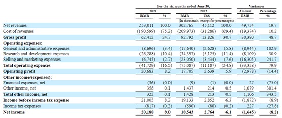 招股書顯示,在過去的2020年、2021年,該公司的營收分別為2.30億人民幣、6.52億人民幣,這期間相應的淨利潤分別為463萬人民幣、3980.30萬人民幣,營收實現了翻倍式躍升,淨利潤亦大幅增長。而在2022年前六個月,該公司實現營收為3.03億人民幣,上年同期為2.53億人民幣,但2022上半年,其淨利潤由上年同期的2018.8萬元下滑至1854.3萬元。