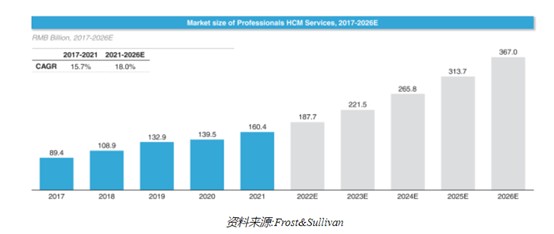 隨着疫情的逐漸退去,防控措施逐漸優化,對就業的復甦需求也逐漸提上日程。根據弗若斯特沙利文報告,近年來,隨着中國企業數量的增長,市場對HCM(human capital management,人力資本管理)服務的需求也隨之增加。而隨着技術進步和疫情影響的推動下,企業的數字化轉型進程將加速,數字HCM市場規模將快速增長,這將反過來擴大中國專業HCM服務的整體市場規模。HCM市場規模預期將於2026年增至3,670億元人民幣,基於2021年的數字,其複合年增長率達18%。