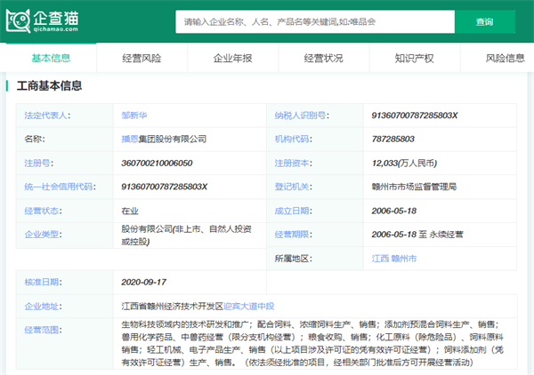 據企查貓,播恩集團股份有限公司成立於2006年05月18日,註冊地位於江西省贛州經濟技術開發區迎賓大道中段,法定代表人為鄒新華。經營範圍包括生物科技領域內的技術研發和推廣;配合飼料、濃縮飼料生產、銷售;添加劑預混合飼料生產、銷售;獸用化學藥品、中獸藥經營(限分支機構經營);糧食收購、銷售;化工原料(除危險品)、飼料原料銷售;輕工機械、電子產品生產、銷售(以上項目涉及許可證的憑有效許可證經營);飼料添加劑(憑有效許可證經營)生產、銷售。(依法須經批准的項目,經相關部門批准后方可開展經營活動)播恩集團股份有限公司對外投資24家公司,具有2處分支機構。