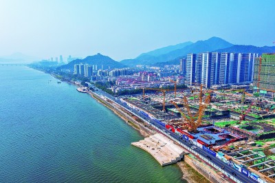 3月9日,浙江省杭州市富陽區秦望通道工程過江隧道實現雙線貫通。秦望通道北起富陽秦望路與金橋南路交叉口、南至秦望南路與學院路交叉口,全長3066米。其中,秦望隧道過江盾構段長1254米,採用公鐵合建制式,分為上下兩層結構,上層為市政隧道層,下層為軌道交通預留層,是首條穿越富春江的過江隧道,也是浙江省首條公鐵合建隧道。秦望通道工程將大幅提升富春江兩岸通勤效率。圖為空中俯瞰富春江畔秦望通道工程過江隧道江北工作井施工現場。