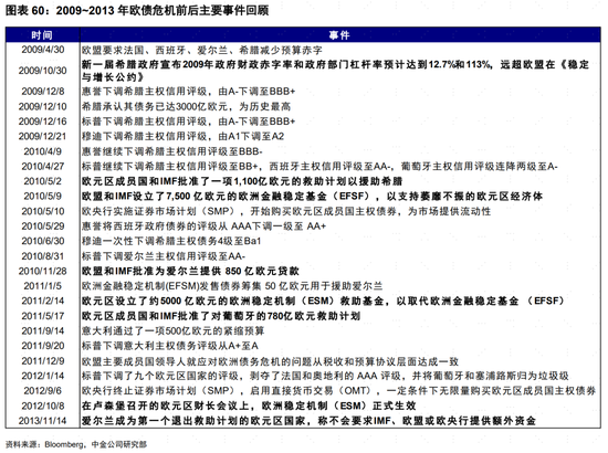 第一階段:希臘債務危機爆發,南歐邊緣國家受到波及。2009年10月,新一屆希臘政府公佈2009年政府財政赤字率和政府部門槓桿率預計達到12.7%和113%,遠超歐盟在《穩定與增長公約》(Stability and Growth Pact)中規定的3%和60%的上限。同年12月,三大評級機構分別下調希臘主權債務評級。到2010年,債務危機蔓延至意大利、葡萄牙、西班牙和愛爾蘭等其他債務壓力較大的邊緣國家。